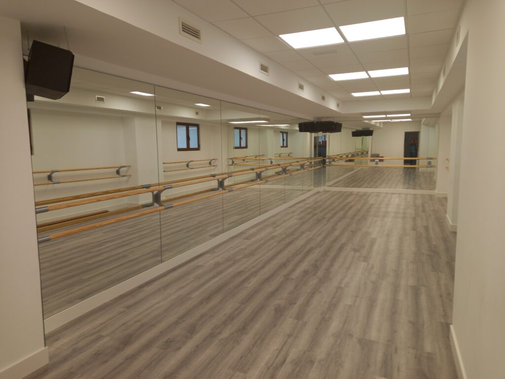 El suelo fue uno de los elementos clave del proyecto. Para ello, seleccionamos un pavimento especializado, adecuado para la danza contemporánea, que proporciona amortiguación y comodidad, cuidando la salud y el rendimiento de los bailarines. Este suelo ofrece una superficie flexible, diseñada para absorber impactos y reducir la fatiga durante las sesiones de práctica.